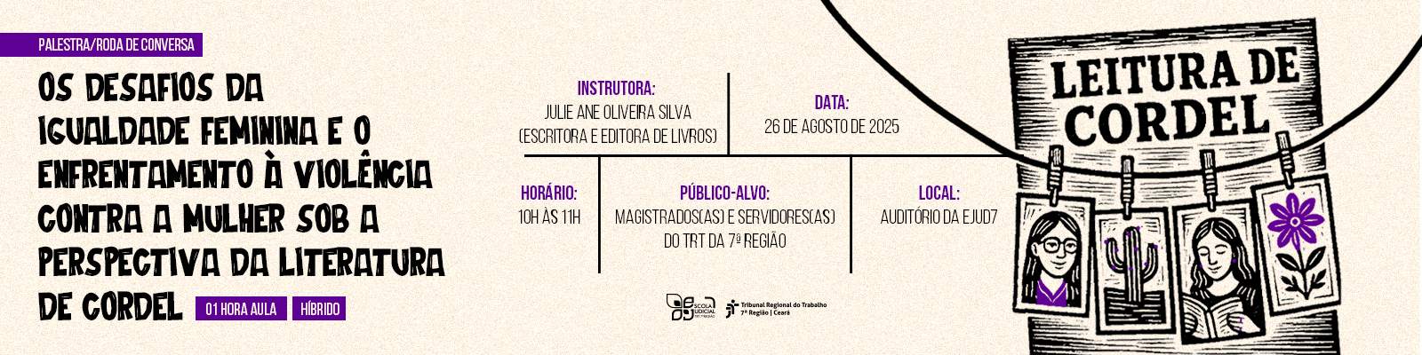 Curso: Palestra/Roda de Conversa: "Os desafios da igualdade feminina e o enfrentamento à violência contra a mulher sob a perspectiva da literatura de cordel" - para o evento “Diálogos Femininos: Para celebrar o dia Internacional da Igualdade Feminina”